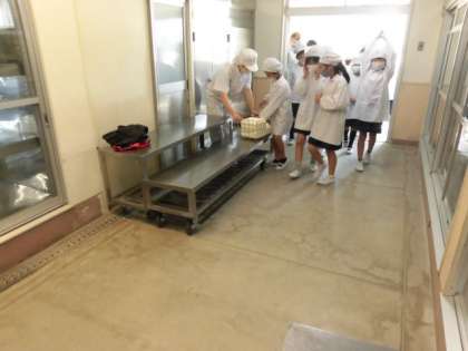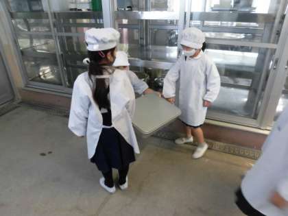 給食棟へ行き給食を受け取り、教室で配膳します。