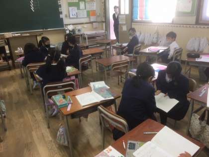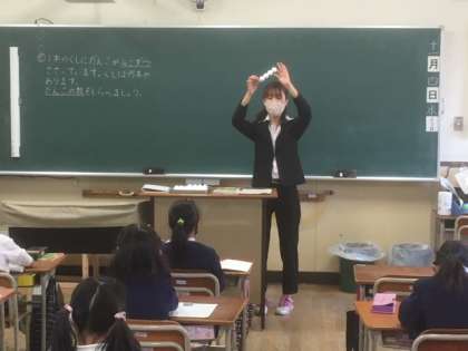 2年生の算数の授業てす。かけ算の4の段の学習です。お団子の小物を使って説明が行われています。
