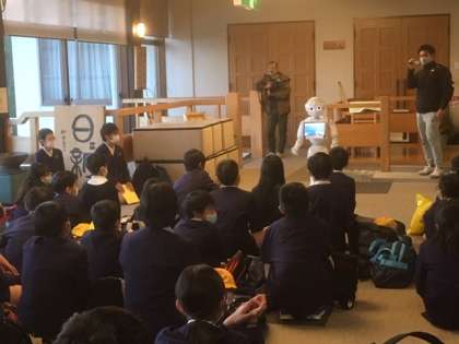 予定通りに宿舎に到着して、入館式を済ませました。宿泊の注意は、ペッパーくんがしてくれました。