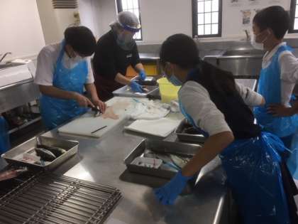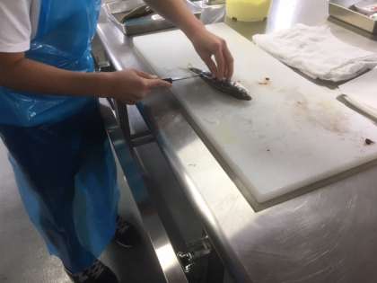 アジをさばく実習です。レクチャーを受けて、1人づつさばいていきます。2匹さばきます。