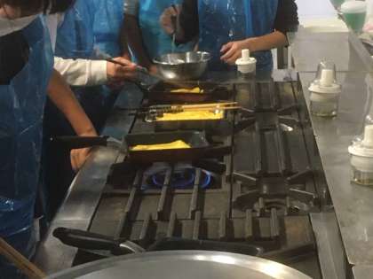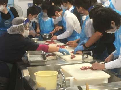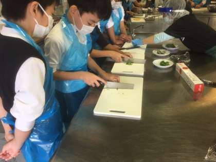 てこね寿司作り体験です。錦糸卵や刺身を作っています。包丁さばきが上手な人もいます。