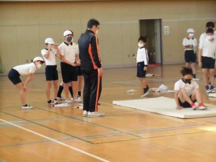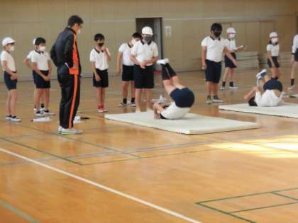 体育館では、マット運動です。前転や後転練習を行っていました。