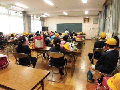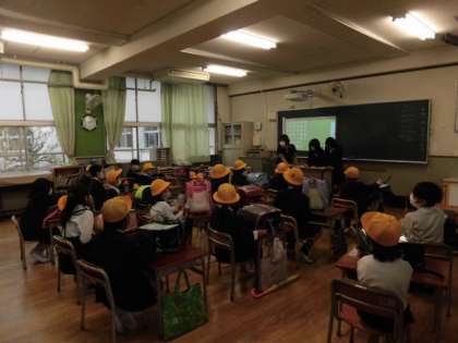 14日(水)、校区内を15班に分けて、各地域別に集まり、班ごとに下校します。集団下校です。集団下校の機会はほとんどありませんが、万が一に備えて近隣の児童が一緒に下校する訓練を行いました。大人数で下校する班もありました。