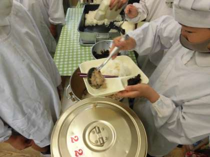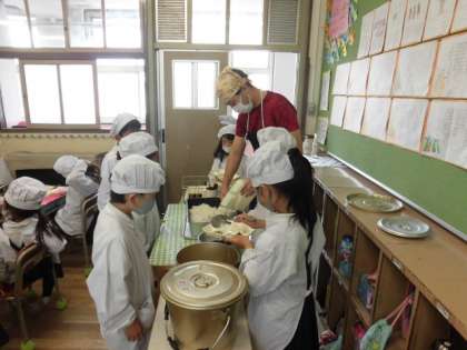 2年生の教室です。給食の準備を一生懸命頑張っています。