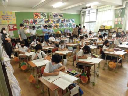 5日(月)、国語授業です。「ことばで絵を伝えよう」の単元です。雪だるまを、他人に分かりやすいように、絵の描き方を説明するという授業です。最初に、大きな丸を二つ縦につなげて書く、など色々考えていました。先生の発問に、子どたちは手が真っすぐピンと上がるので、感心します。後ろで授業の様子を先生たちが見ていました。