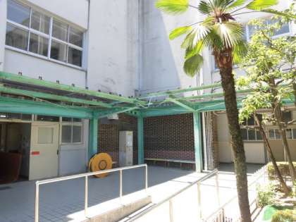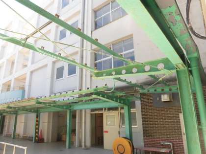 下準備で、校舎の周りに足場を組むために、中庭に設置されている屋根を撤去しています。工事が終われば、屋根は復元され余す。