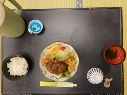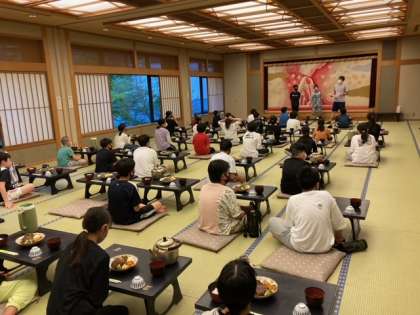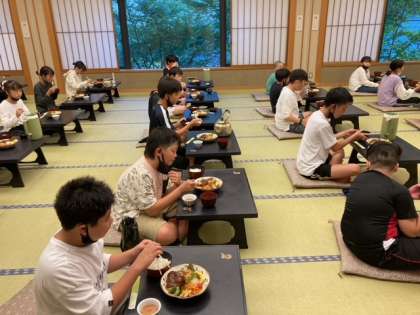 夕食の時間です。係の人が前に出ていただきますの号令がかかり食事が始まりました。