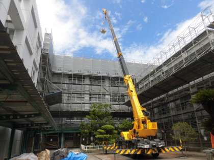 工事で大きなクレーン車が中庭に入ってっきました。工事で屋上から出た廃棄物をクレーン車で降ろしています。児童が不在中にどんどん工事が進んでいます。
