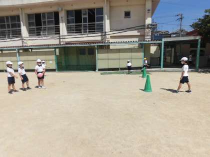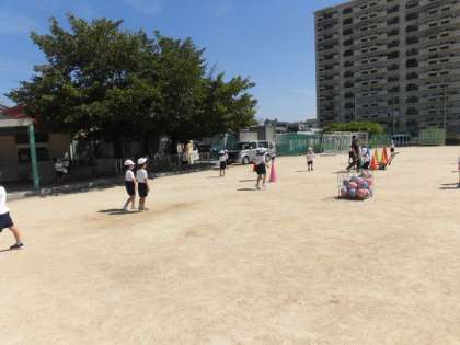 27日(金)、1年生がグランドで、ボールを使って体育の授業を行っていました。