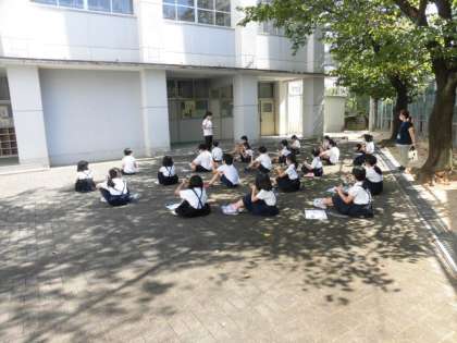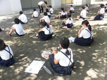 4日(月)、音楽の授業で笛の練習です。笛を吹くので風通しの良い屋外で授業しています。木漏れ日の中で行われる授業、横から見ているとのどかな感じがします。