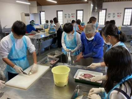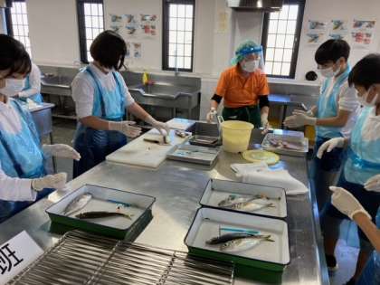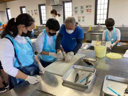 釣ったあじをさばいています。そして、ひものを作ります。包丁さばきで悪戦苦闘しています。