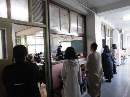 教室の廊下側の窓を外しています。保護者の方は、廊下からの見学になります。