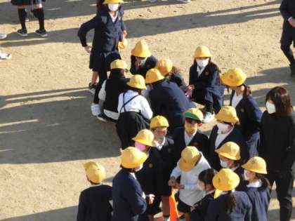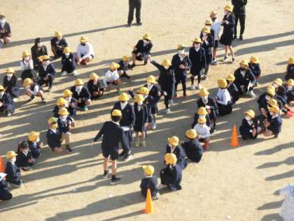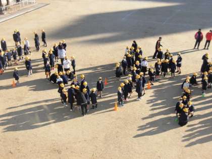 グランドにお宝(輪ゴム)を事前にまいていて、それをグループで集めるゲームです。