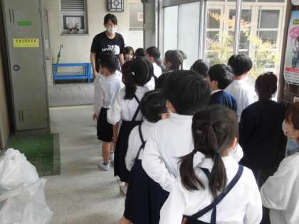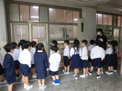 13日(水)、1年生が校舎探検で、担任の先生と校内を巡りました。