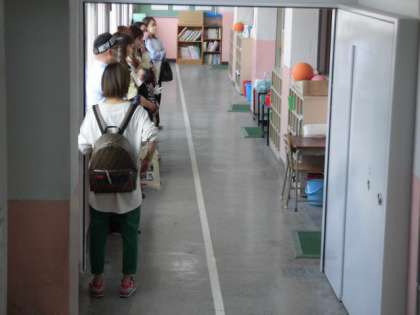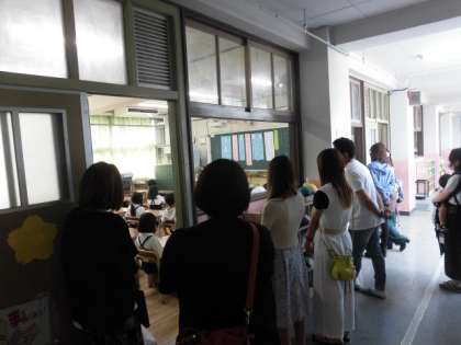 コロナ感染予防で廊下からの参観です。
