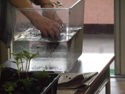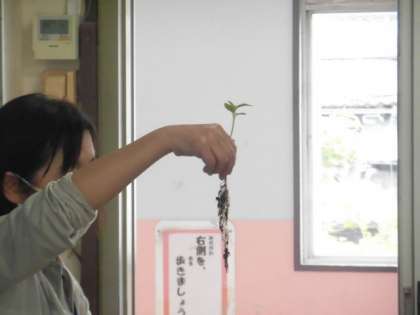 先生が植物をポットから取り出し、水槽で土を洗い流し、根を見せていました