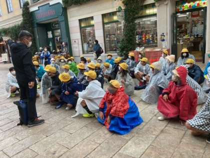 園内で説明を聞いて、さあ、これから自由行動です。雨が降ってあますが、元気にアトラクションへ向かいました。