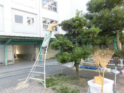 8日(火)、管理作業員が、中庭の樹木の剪定を行っています。