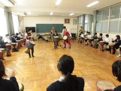 2日(木)、5年生がアフリカンパーカッションの講師を招き授業を受けました。合計3時間の授業で、今回が3時間目の授業です。太鼓のたたき方も上手になっています。最後は、太鼓をたたいたり、ほかの楽器を使ったりしながら教室内を動き回っていました。長い間太鼓をたたくので、手のひらが痛くなりますが、楽しんでたたいていました。