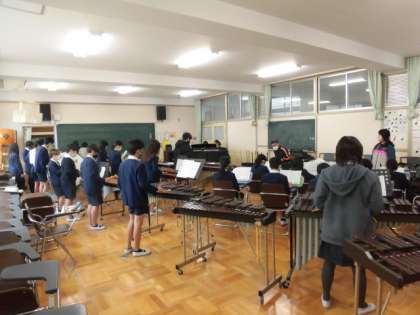 13日(月)、音楽室で、1組、2組合同で合奏練習しています。