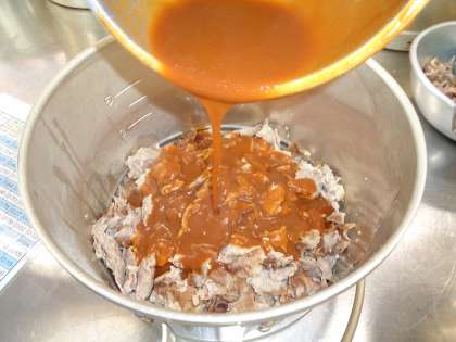 「豚肉のデミグラスソース」は下味を付けて焼いた豚肉に、りんごピューレ、デミグラスソース、ウスターソース、ケチャップを合わせたソースをからませて作りました。ソースのうま味と豚肉が合い、子ども達に大人気でした。