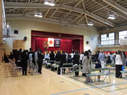 令和5年度入学式を行いました。新入生は54名です。最初はわからないことも多くて、不安な気持ちもあるかと思いますが、頑張って小学校生活を始めていきましょう。2年生の児童からお祝いメッセージビデオの放映や担任の先生からのお話がありました。