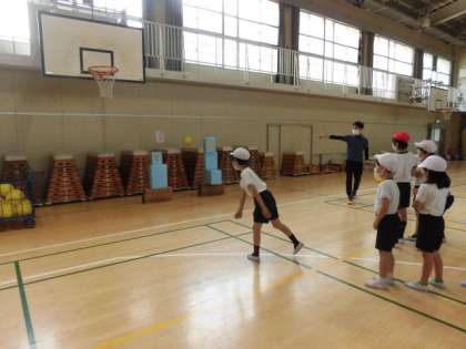 体育館で体育の授業をしています。いろいろな運動を順番に行っていくサーキットトレーニングをしていました。跳び箱を跳んで、ボールを投げて、マットの上に飛び降りたり、平均台を歩いたり、マット運動をしたりしていました。子どもたちは、元気に活動していました。