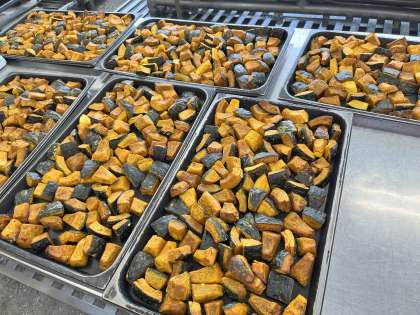 「焼きかぼちゃ」の味付けは、塩のみです。スチームコンベクションという大きな焼き物機で焼きます。皮もやわらかくなりました。