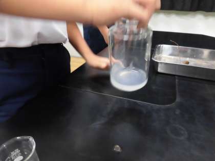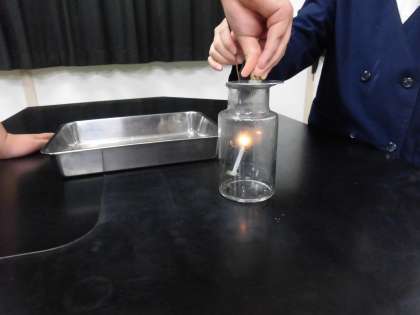 6年生が理科室で、「石灰水で二酸化炭素があるかどうか調べる実験」をしていました。集気びんの中で、ろうそくで火を燃やし二酸化炭素を発生させます。その中に透明な石灰水を入れて、びんを振ると石灰水が白く濁るという実験です。小学校でよく行う実験なので、保護者の方も行った方もおられると思います。二酸化炭素を検出する試薬として、広く使われる石灰水を使った実験です。