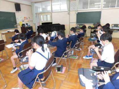 音楽室で3年生が授業していました。「ともだち」という曲を歌っていました。ともだちへの思いを込めて歌うことをテーマにしていました。
