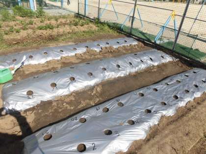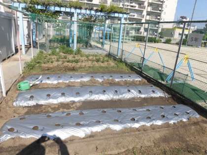 マルチシートに穴をあけ、平野区役所からいただいた綿の種を3粒ずつまきました。あとは、水やりをして育てていきます。早く発芽してほしいです。