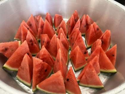 「すいか」は、果肉の中心部が一番甘いとされています。給食ですいかを切るときは、全員に甘い部分がいきわたるように工夫しています。1玉を64等分にします。