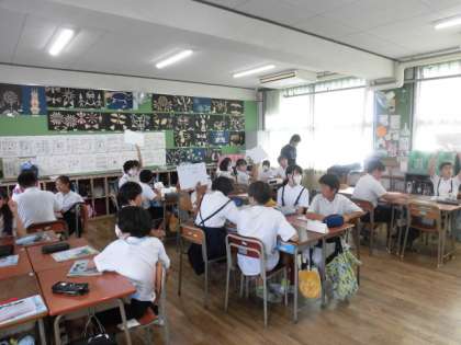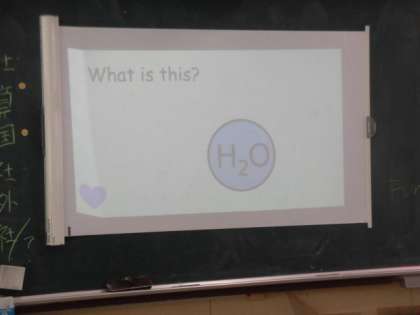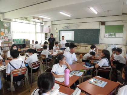 6年生の英語の授業です。机をつけてチームを作り英語でクイズ大会です。C-NETから問題を英語で出され、それをホワイトボードに書いて提示します。正解なら2点、合計得点をチームで競います。答えが、「水」の問題がありました。子どもたちは、答えを英語で書くのが難しそうでした。