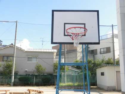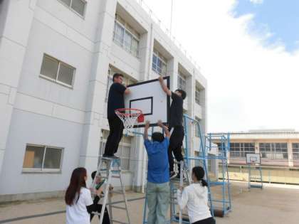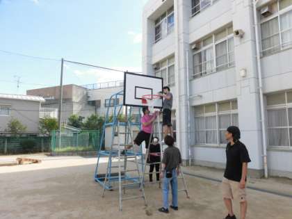 グランドのバスケットボールのボードを取り外し、夏休み中に整備していました。完成したので取り付けました。新しくなったバスケットボールゴールで休み時間遊んでください。