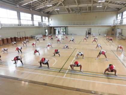 8日(金)、4年生が体育館で運動会団体演技の練習をしています。