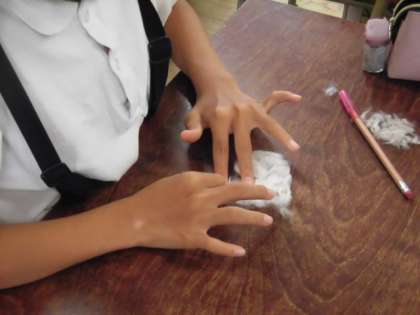 20日(水)、大学の先生を招いての綿の授業4回目となりました。今回は、学習園で収穫した綿を使って綿くり(綿から種を取る作業)を行い、その綿を棒状にしていきます。綿から種を取る作業は、種に綿が頑丈にまとわりついているので、綿から種を取る作業は時間がかかり大変です。その後、その綿を鉛筆の棒の部分を使って丸めていき棒状の綿にしていきました。1時間の授業では、綿から種を取り除き、棒状にするまでしかできませんでした。次回の授業では、棒状にした綿を糸にしていく作業を行う予定です。