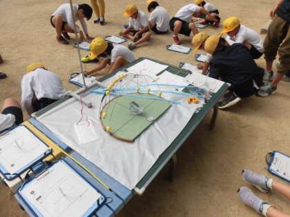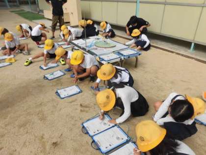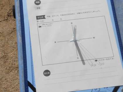 12日(木)、3年生が理科の授業で、グランドに出ていました。かげで太陽の動きを観察しています。太陽が雲から出てくる時を待って、かげの方向を観察していました。