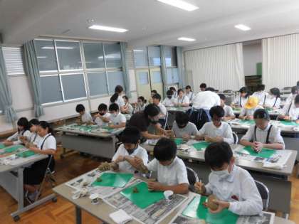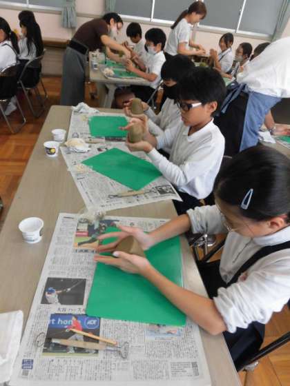 6年生が講師の先生を招き、埴輪作りの授業を受けています。