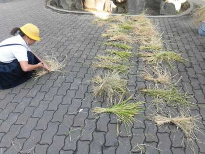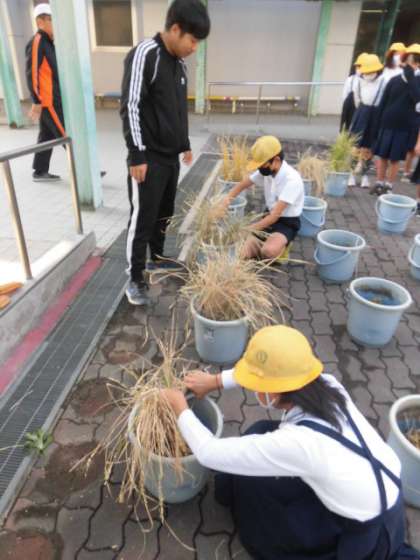 16日(月)、5年生が育てていたバケツ稲の稲刈りをしました。