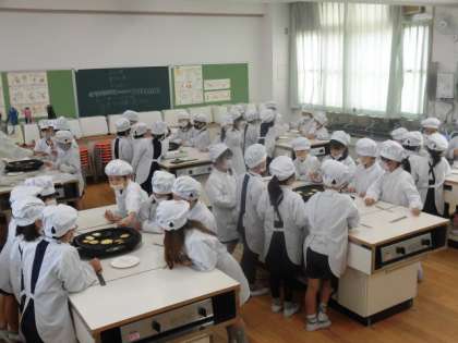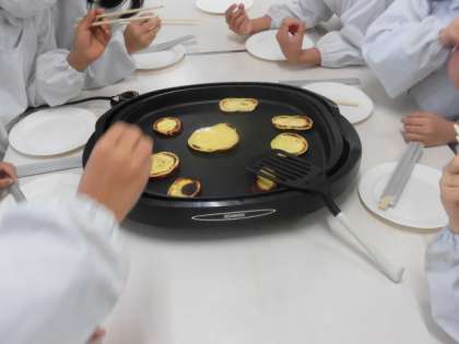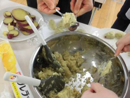 28日(火)、2年生が学習園で収穫したサツマイモを使って家庭科室で調理しました。焼きいも、蒸かしいも、スイートポテトを作っていました。焼きいもは、ホットプレートを使って焼き竹串を使って出来上がったか確認をしていました。