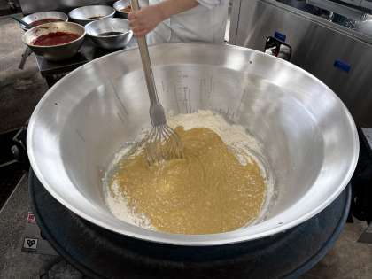 ハヤシライスのルウは、綿実油で小麦粉を褐色になるまでいためてつくります。釜の底に小麦粉が焦げ付かないように絶えず混ぜます。今日は45分くらい混ぜ続けました。