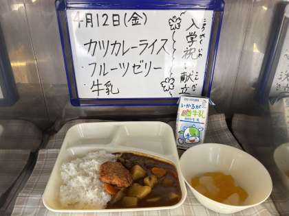 今日は、入学祝い献立でした。本校でも一番人気のカレーは、すぐ完食しました。4月からカレーライスは、米粉で作られたカレールウの素を使用しています。辛さが控えめになっていたので、食べやすかったと思います。