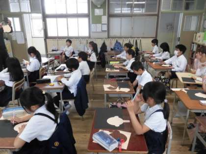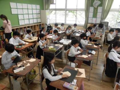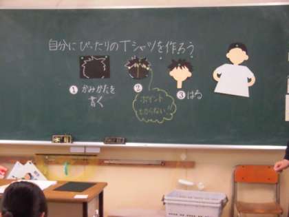 3年生図画工作の授業です。Tシャツを着た自分の上半身姿を作り、そのTシャツの図柄を書くことが、今回の作品です。最初に、色画用紙を切り自分の顔を作っています。どのような作品が出来上がるか楽しみです。