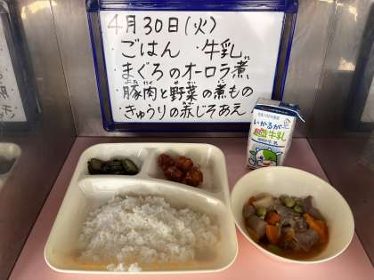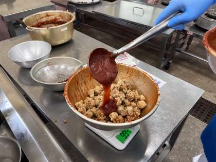 まぐろのオーロラ煮は、ケチャップ、砂糖、赤みそで作ったタレを、揚げたまぐろにからませてつくります。タレをまんべんなくからませるために大きなボウルを使います。