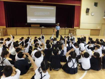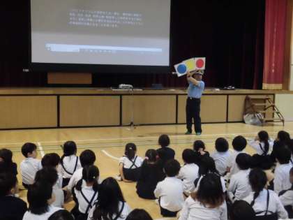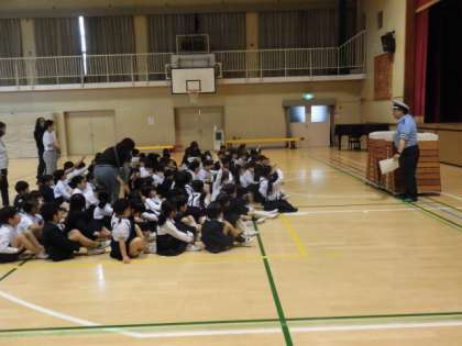 1,2年生が交通安全教室で道路の歩行についての話を聞きました。