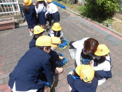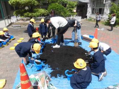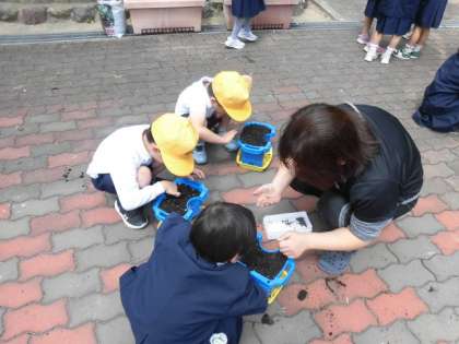 1年生がアサガオの種まきをしました。植木鉢に土を入れて、