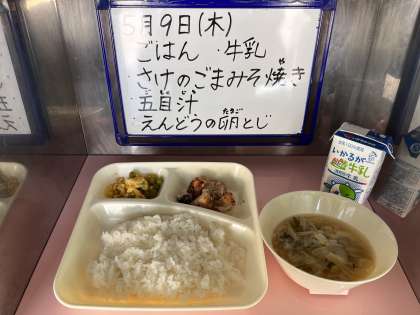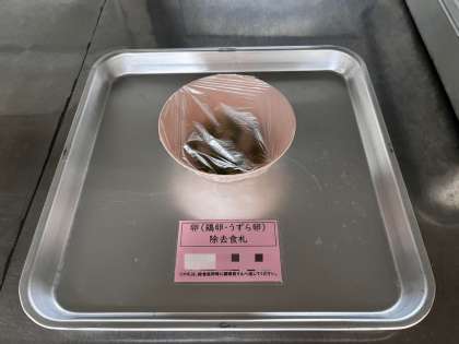 「えんどうの卵とじ」のえんどうは、給食室でさやから取り出したものを使っています。また、卵アレルギーの児童には、卵を除去したものを提供しています。