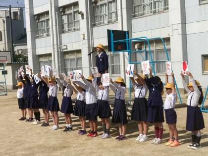 全校集会で、今年度の学校スローガンが発表されました。スローガンは、「日本一礼儀正しくいつも全力な喜連小学校!」です。画用紙に書いて全校児童に紹介しました。