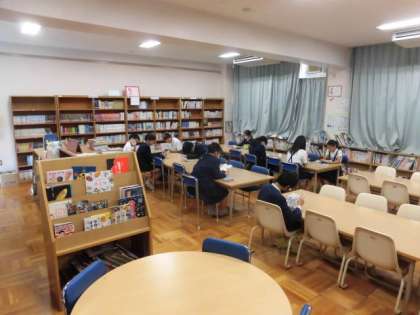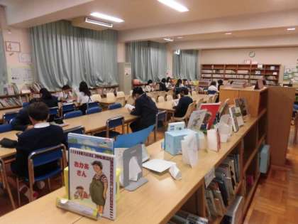 6年生が図書室へ行って、読書を行っています。シーンと静まった中で読書を行っていました。「平ちゃん読書カード」を持っていました。6年生は3000ページ読破で平野区役所から表彰されます。