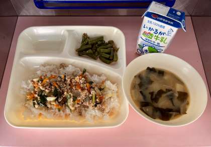 「さんどまめのごまあえ」は、ねりごま、砂糖、こいくちしょうゆ、いりごまで味付けしました。苦手な子が多いさんどまめですが、ごまとしょうゆの香りを強く感じるので、食べやすかったそうです。